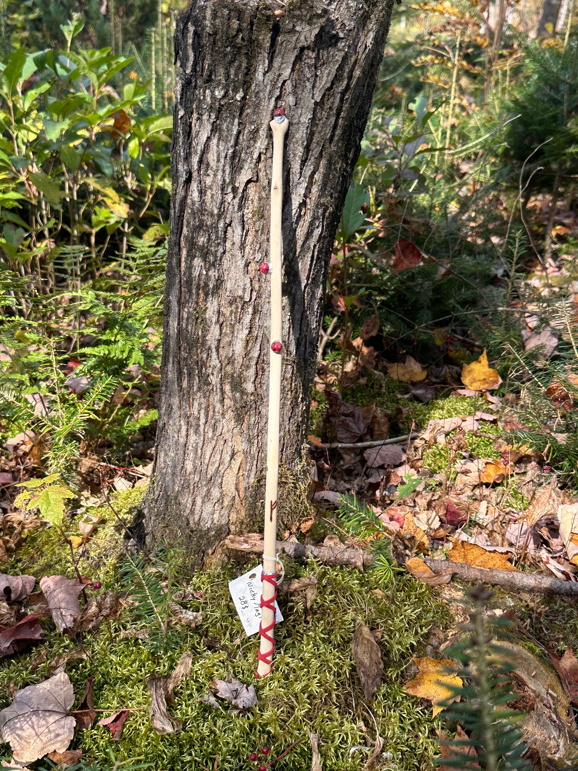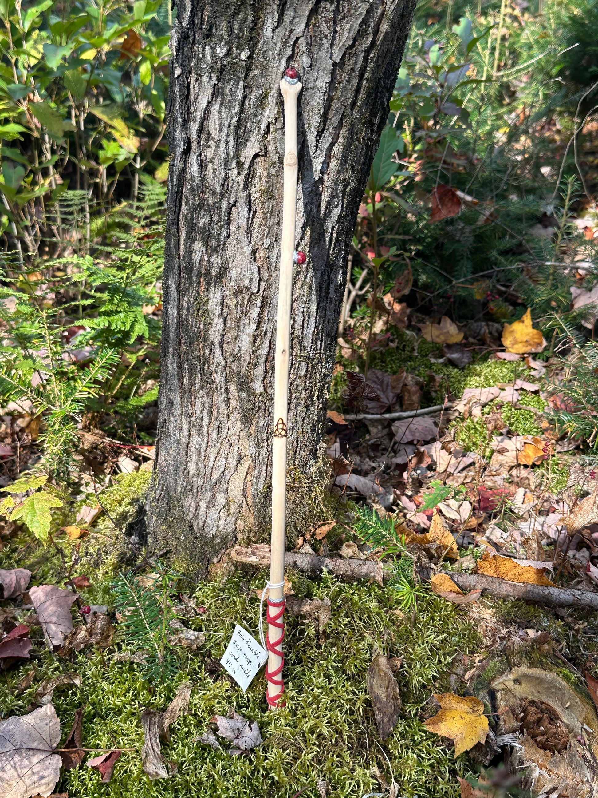 Baguette confectionner à partir d'une branche de érable prélevé dans la nature accompagné de 3 pierres de jaspes rouges, corde de suède rouge au manche ainsi que de runes (fehu et triquetra). Enfin, elle mesure 44cm et demi de long.