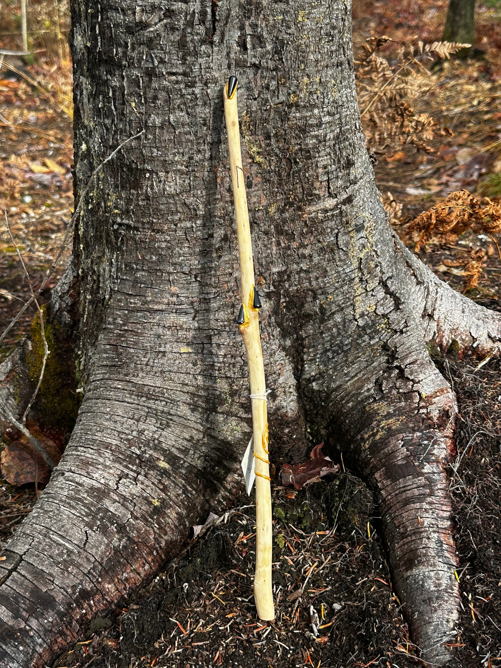 Baguette confectionner à partir d'une branche de sapin prélevé dans la nature accompagné de 3 pierres d'hématites, ainsi que d'un pentacle et d'une rune (uruz). Enfin, elle mesure 38cm et demi de long.