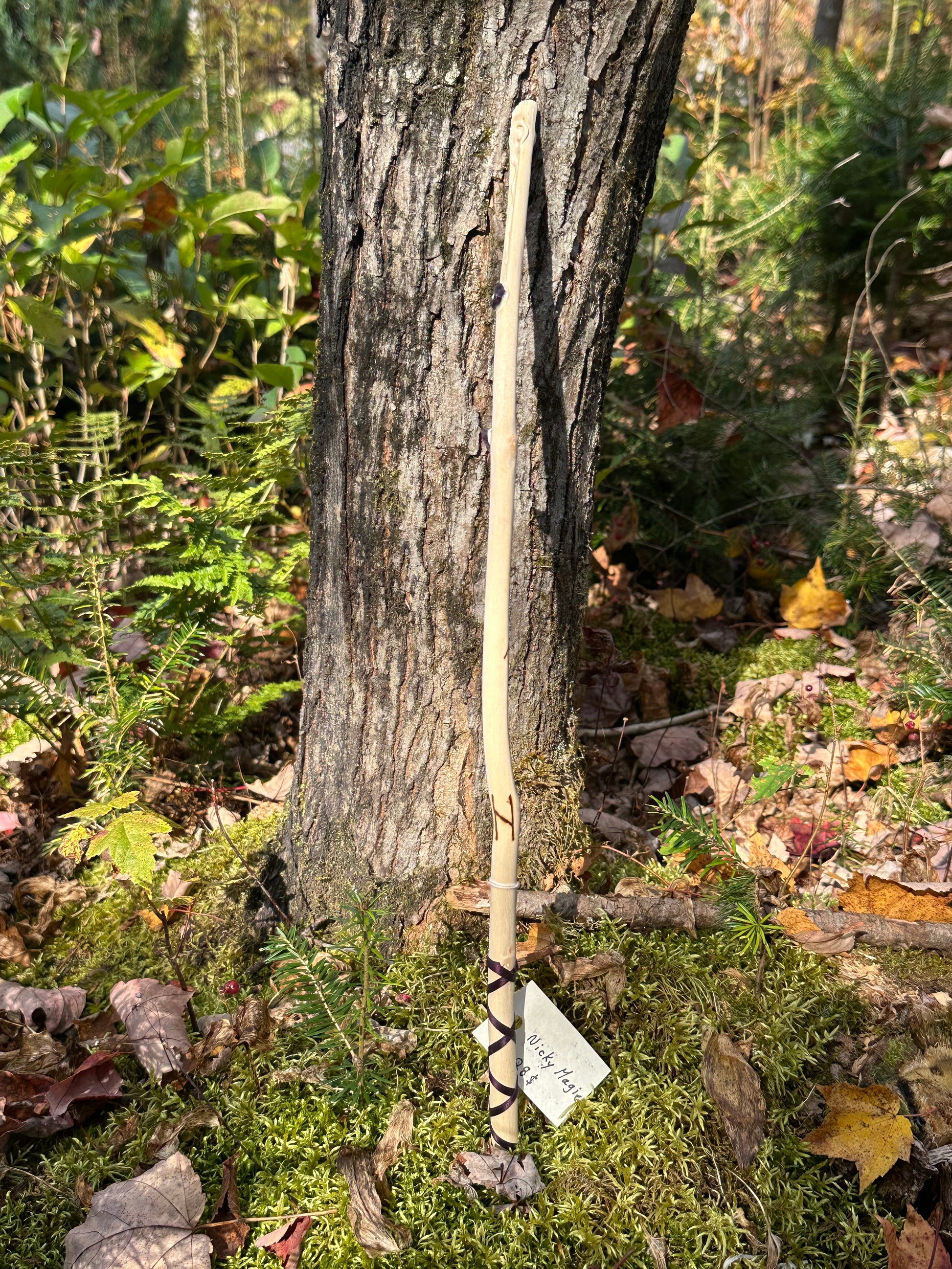 Baguette confectionner à partir d'une branche d'érable prélevé dans la nature accompagné de 3 pierres d'amétistes, ruban violet au manche ainsi que de runes (tiwas du courage et hagalaz d'évolution). Enfin, elle mesure 45cm de long.