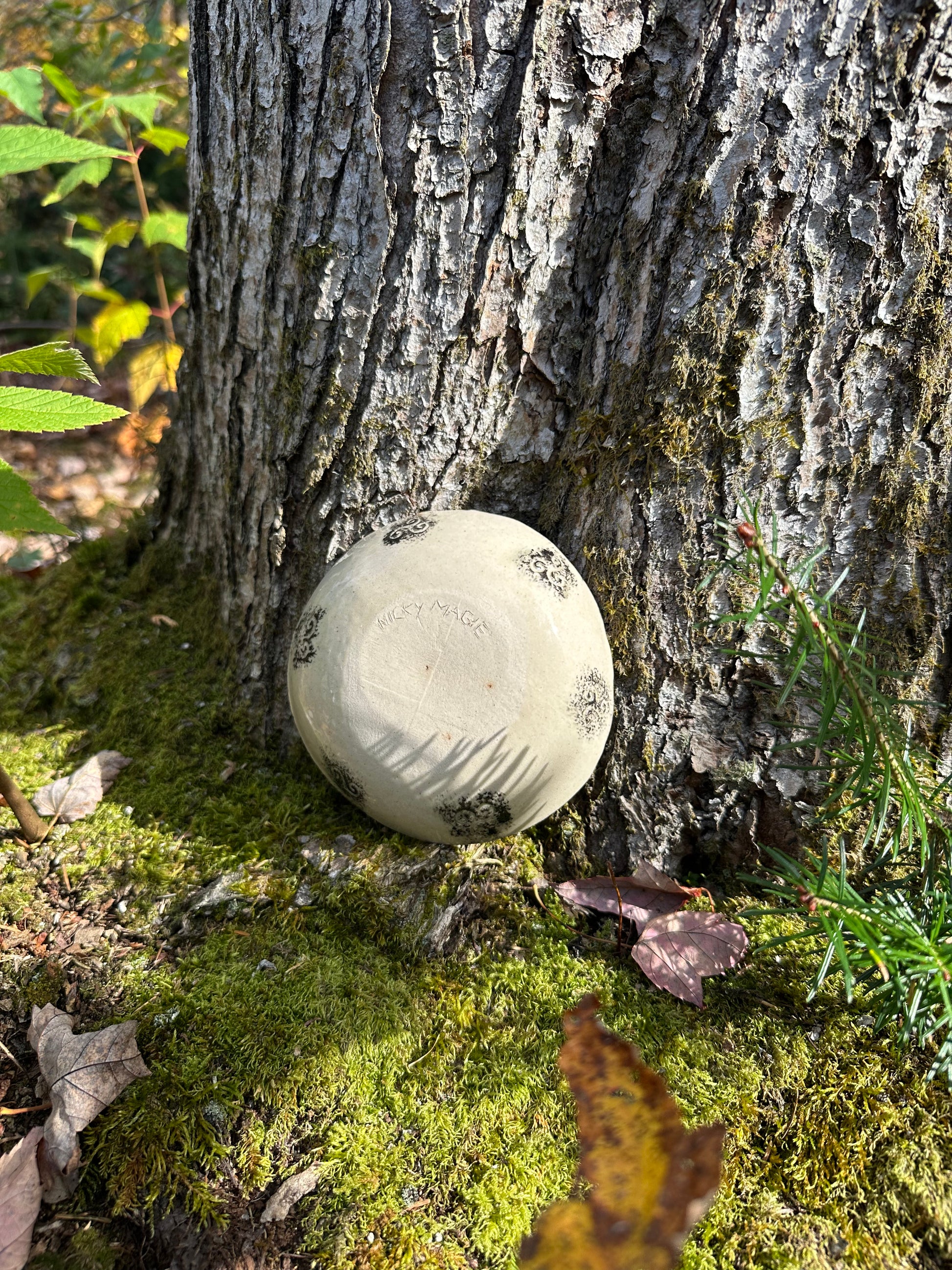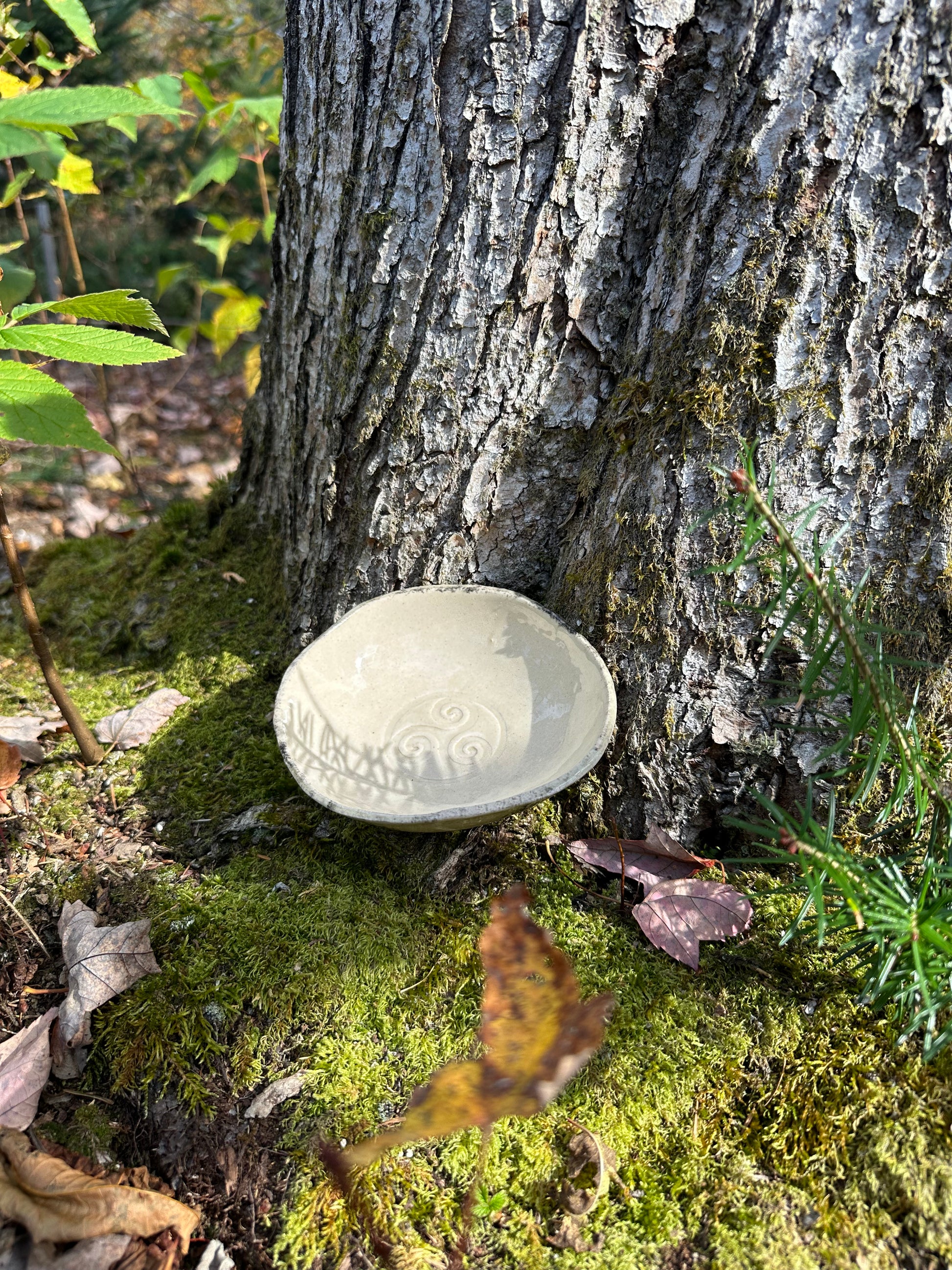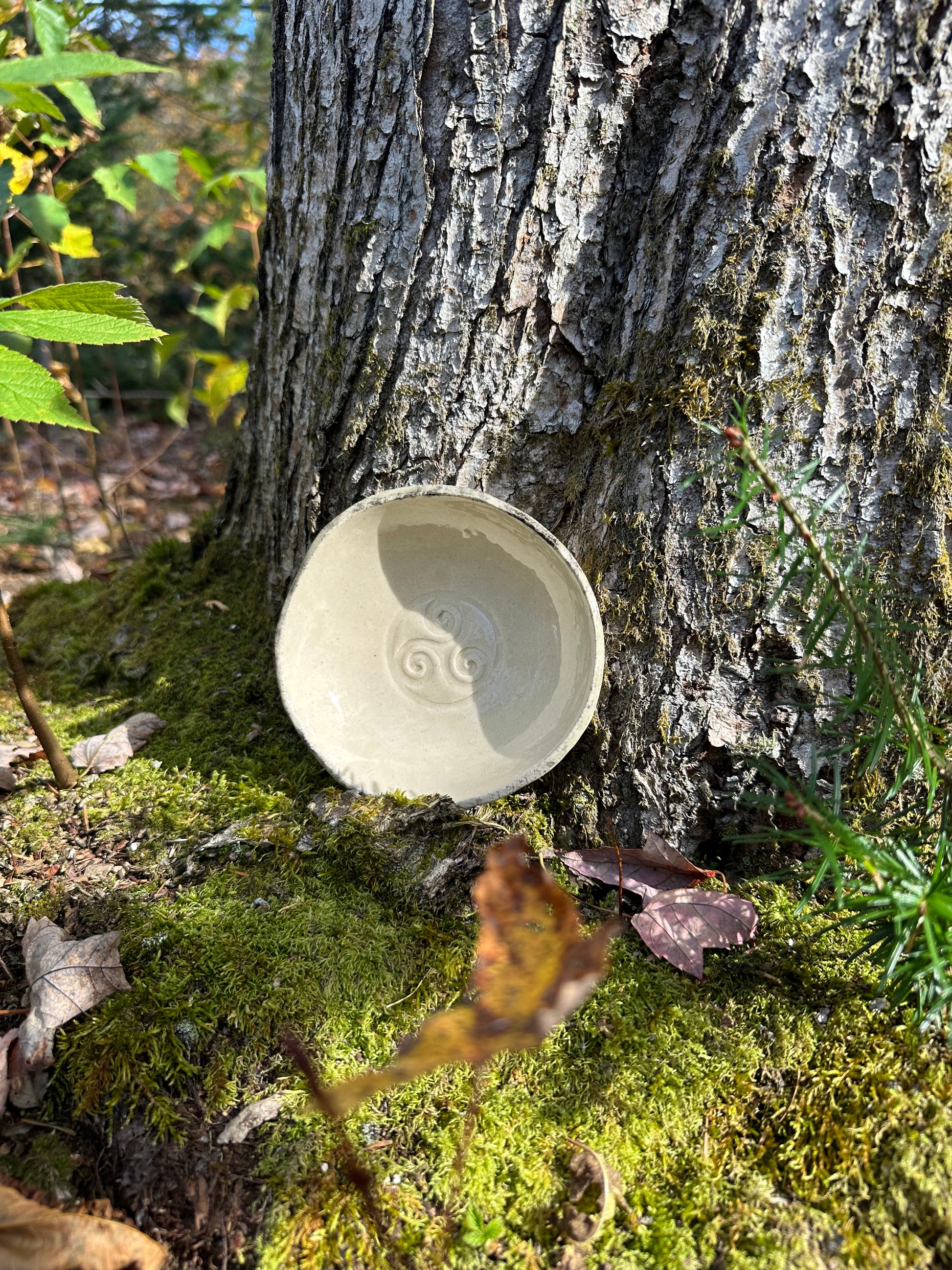 Bol fabriqué à la main, en céramique blanche avec symbole de triskel. Mesure environ 12cm et demi de diamètre et 3 cm de haut pour un poids de 133g. Peut aller au lave-vaisselle et supporter de hautes températures (+2000°C).
