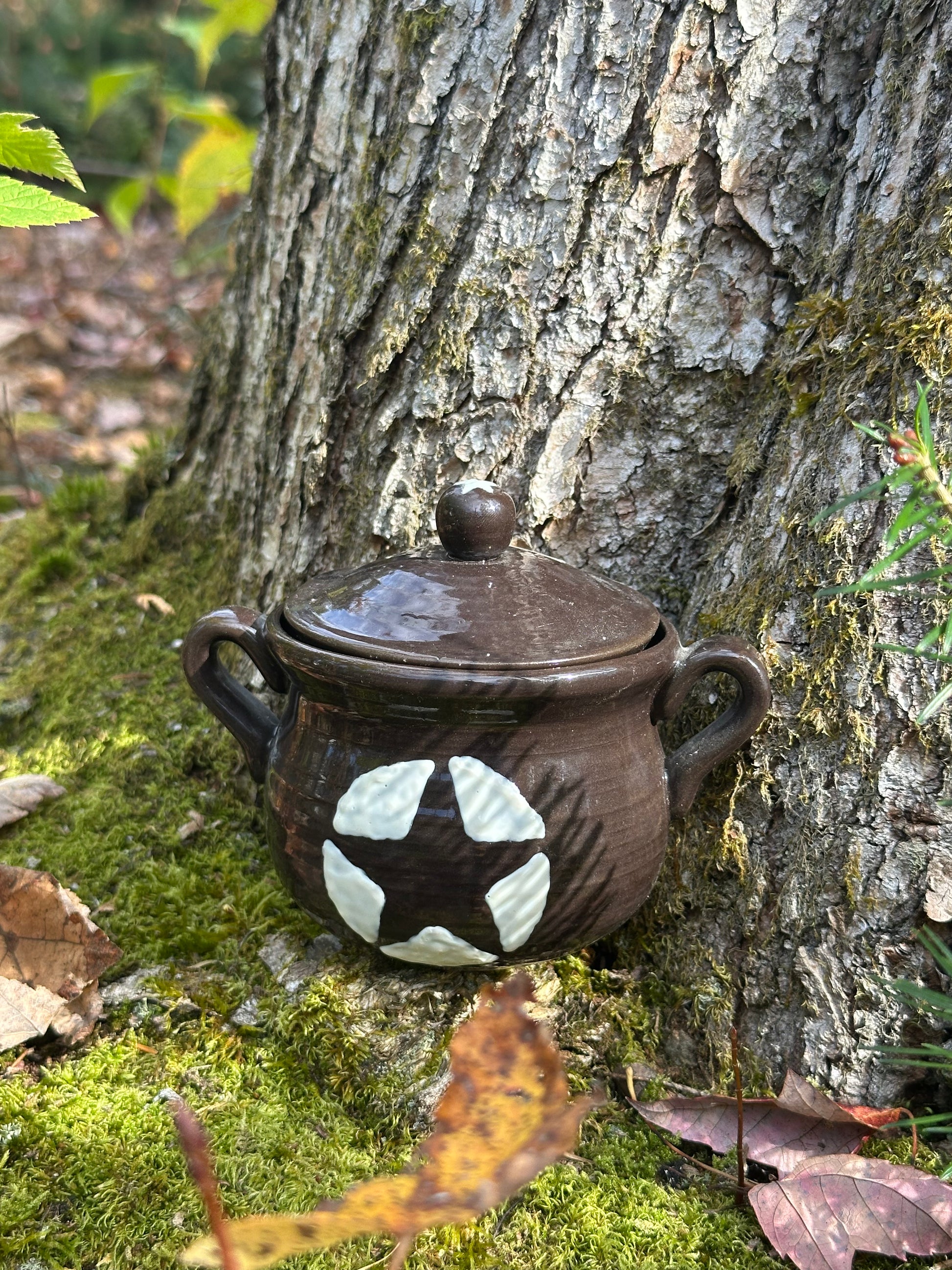 Petit chaudron de céramique brune avec symbole de pentacle. Il mesure 13cm de large (poignées incluses), a une hauteur de 10cm (poignée incluse) et pèse 232g.