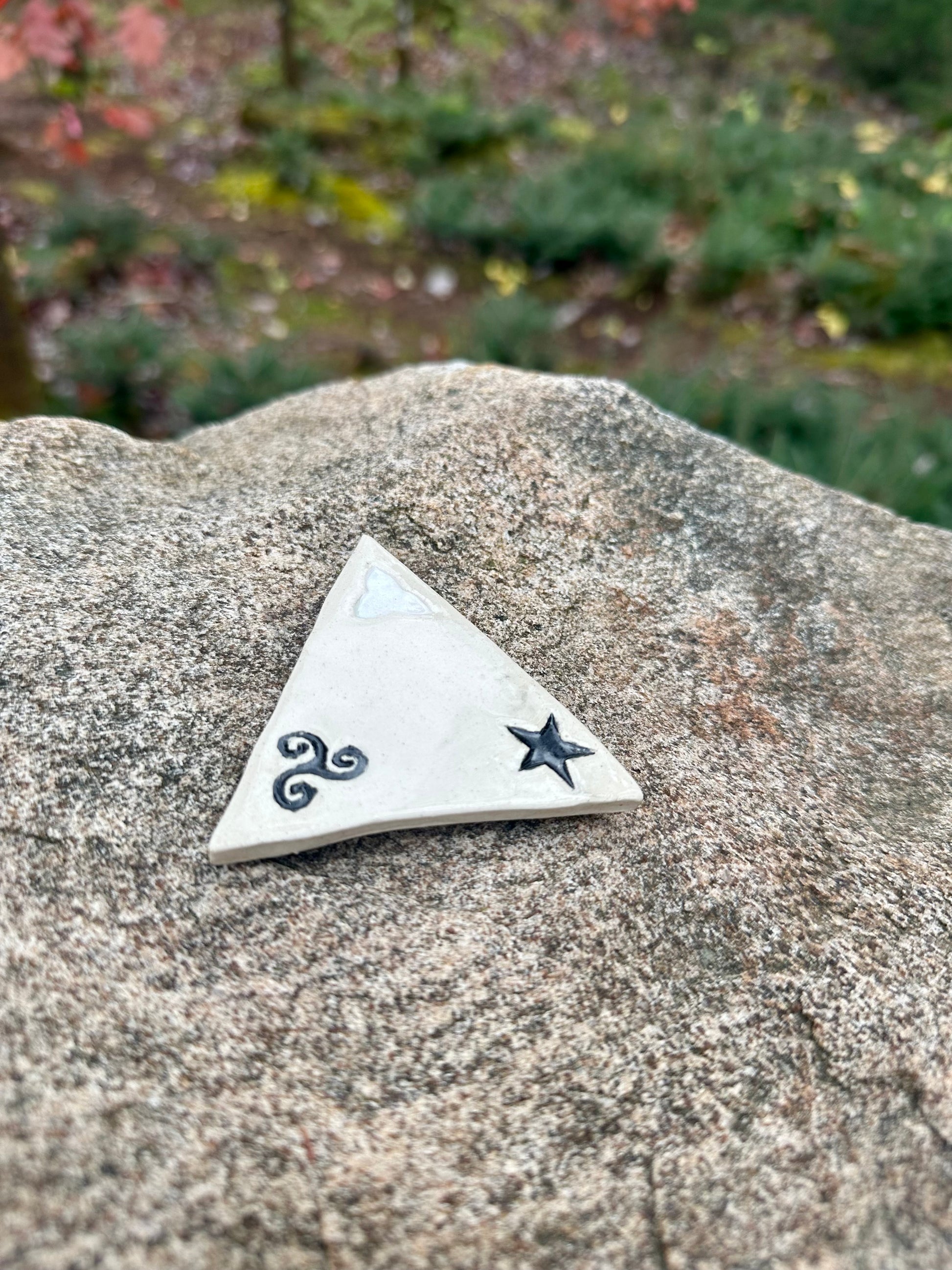 Plaquette encensoir en céramique avec triskèle, triquetra et étoile pour cônes d'encens d'environ 7,5 cm par 7 cm.