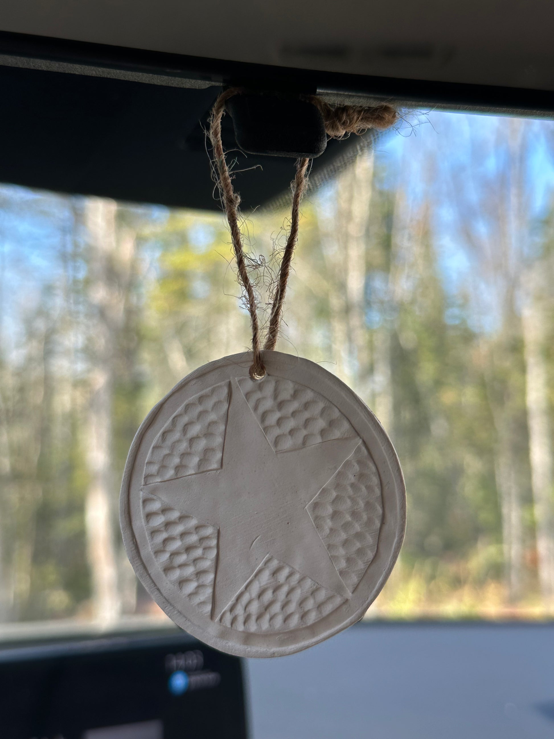 Petit médaillon de céramique fait à la main avec symbole celte (pentacle). Parfait pour la voiture ou même de petites pièces. Ajouter deux ou trois gouttes de l'huile essentielle souhaitée pour une diffusion en continu d'environ une à deux heures. Vous pouvez donc changer d'huiles essentielles, sans crainte que l'huile essentielle ne tache le médaillon.