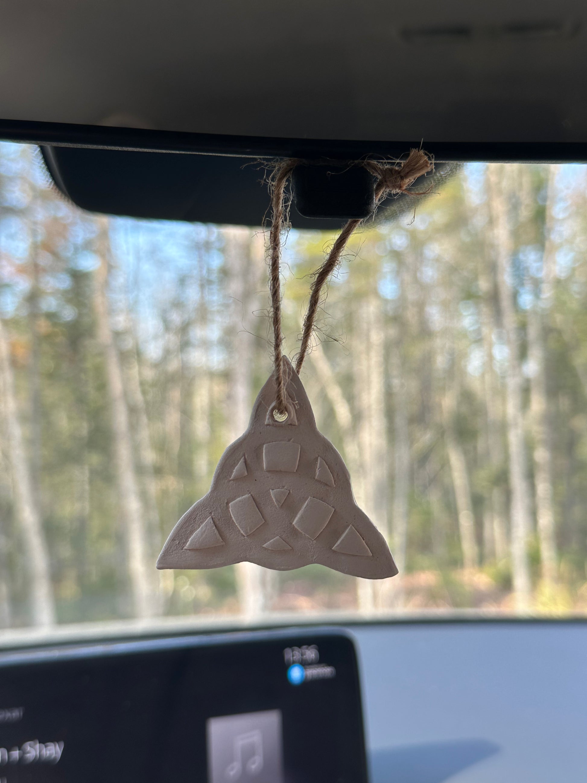 Petit médaillon de céramique fait à la main avec symbole celte (triquetra). Parfait pour la voiture ou même de petites pièces. Ajouter deux ou trois gouttes de l'huile essentielle souhaitée pour une diffusion en continu d'environ une à deux heures. Vous pouvez donc changer d'huiles essentielles, sans crainte que l'huile essentielle ne tache le médaillon.
