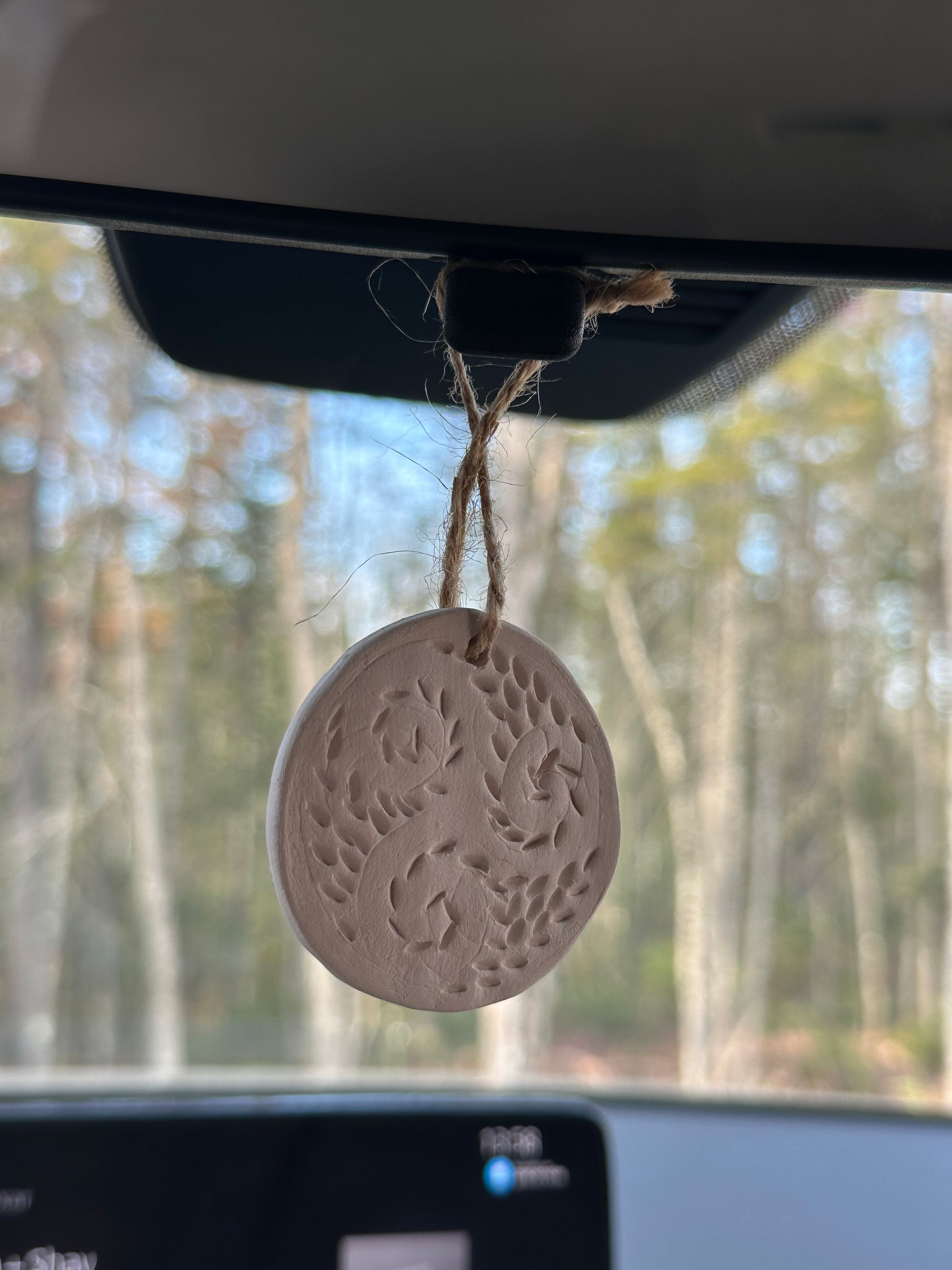 Petit médaillon de céramique fait à la main avec symbole celte (triskel). Parfait pour la voiture ou même de petites pièces. Ajouter deux ou trois gouttes de l'huile essentielle souhaitée pour une diffusion en continu d'environ une à deux heures. Vous pouvez donc changer d'huiles essentielles, sans crainte que l'huile essentielle ne tache le médaillon.